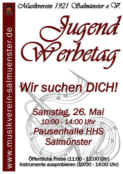 Du willst ein Instrument lernen oder spielst bereits eins? Du hast Spaß am gemeinsamen Musizieren? Dann besuche uns an unserem Jugendwerbetag am Samstag, dem 26.05.2018, von 10.00 bis 14.00 Uhr in der Pausenhalle der Henry-Harnischfeger-Schule in Salmünster.