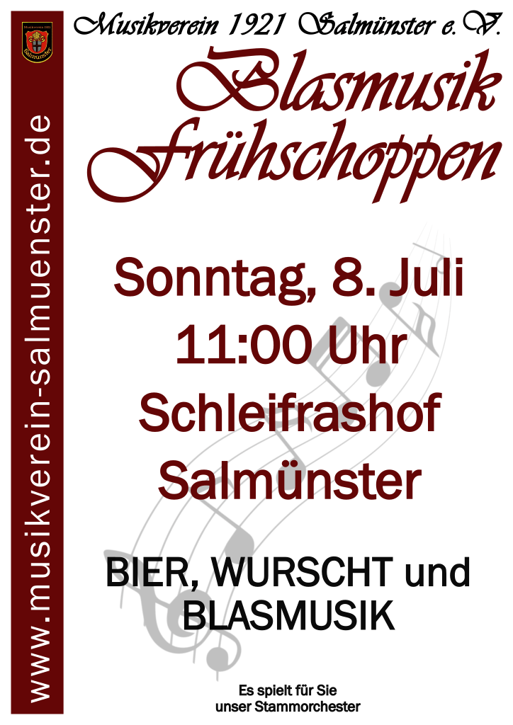 Es ist wieder so weit! Der Musikverein 1921 Salmünster veranstaltet seinen jährlichen Blasmusikfrühschoppen. Dieser findet am Sonntag den 08.07. im Schleifrashof Salmünster ab 11 Uhr statt.